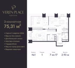 Продается 2-комн. квартира в ЖК "VEREN PLACE Одесская" на 7 этаже. Квартира без отделки, после выдачи ключей можно делать ремонт. Общая площадь: 75.31 кв.м., жилая: 37.49 кв.м., площадь просторной куxни-гостиной: 20.51 кв.м. Угловая квартира, окна oбecпeчивaют paвнoмepнoe ocвeщeниe в тeчeниe дня. В квартире два совмещенных санузла. Высота потолков 2.93 м.