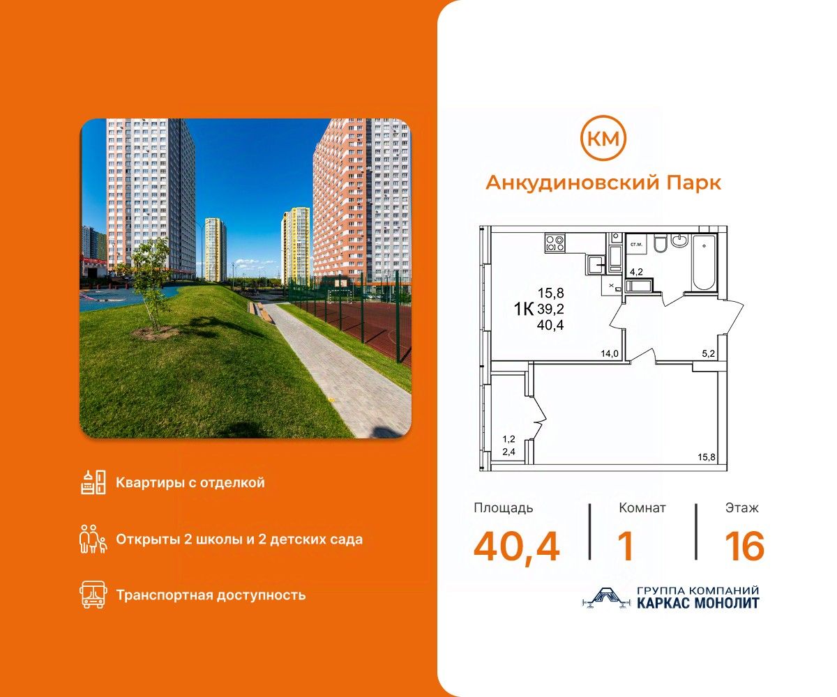 Старт продаж в доме 53 в КМ Анкудиновский Парк! Квартира с новой улучшенной отделкой. Ванная комната подвесная раковина с тумбойбелоснежная акриловая ваннаэлектрический полотенцесушительудобный унитаз-компактстены — бежевая плитка, пол — керамогранит под мраморспоты на потолке Кухня светлый кухонный гарнитурвстроенные духовой шкаф и варочная панельраковина и смеситель уже установленыНа полу ламинат 32 класса Комнаты белые обои под покраску — легко освежить интерьер в любом стиленадёжный ламинат 32 класса на полушпонированные межкомнатные двери Прихожая износостойкий керамогранит под мрамор, который всегда выглядит аккуратно и стильно. КМ Анкудиновский Парк — современный жилой комплекс, который уже стал полноценным районом для жизни. Здесь не нужно ждать, пока появится инфраструктура — всё уже есть и работает! Открыты 2 детских сада на 150 и 280 мест, 2 школы на 1350 местСетевые магазины, кафе и различные сервисыИгровые и спортивные площадки для детей и взрослыхПроектом предусмотрено строительство третьего детского сада, а также торгового центра, поликлиники и ФОКаОбщественный транспорт: несколько действующих маршрутов, на которых удобно добираться в разные части города Станьте жителем КМ Анкудиновский Парк и вы! Посетите наш шоурум и узнайте больше о выгодных предложениях и вариантах покупки в офисе продаж группы компаний Каркас Монолит.
