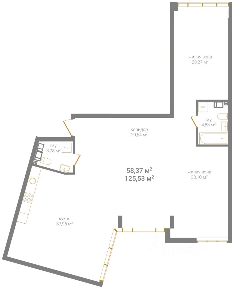 Квартира свободной планировки, 125,53 м²