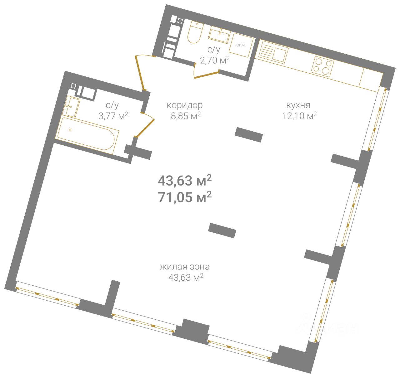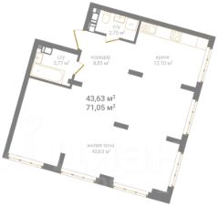 Квартира свободной планировки, 71,05 м²