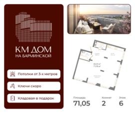 Жить в КМ Доме на Барминской, значит чувствовать себя на вершине — весь город у ваших ног, а с высоты открываются поистине фантастические панорамы. Исторический центр, площадь трех церквей, виды на живописные изгибы Оки и Волги и утопающие в зелени Дятловы горы, яркие огни любимого города — все это только ваше. Позвольте себе больше и обретите дом с видом на любимый Нижний. Дом введен в эксплуатацию. Ключи скоро. КМ Дом на Барминской это: Неповторимая архитектура и квартиры редкого формата 182 квартиры площадью от 27 до 246 м² Квартиры с террасами + общая видовая терраса на крыше Панорамное остекление Дизайнерские входные группы и бесшумные лифты Подземный паркинг и келлеры для хранения Умный дом, бесключевая система доступа по Face ID, комплексное видеонаблюдение Закрытая благоустроенная территория В шаговой доступности от вашего будущего дома находятся современные торговые центры, уютные кафе и рестораны, а также все необходимые сервисы для комфортной жизни. Рядом находятся старинные памятники культуры, университеты и строится ИТ-кампус мирового уровня "Неймарк". Развитая дорожно-транспортная сеть позволяет легко добраться в любую часть города. До Кремля всего 10 минут на машине, в шаговой доступности площади Лядова и Горького. Для семей с детьми здесь созданы идеальные условия рядом расположены детские сады и школы. Также утверждено строительство детского сада на 150 мест по соседству с КМ Дом на Барминской.