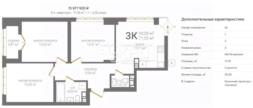 Общая площадь квартиры 71,33 м2, кухня 15,11 м2, три комнаты 12,41 м2, 13,53 м2 и 13,34 м2, лоджия 2,87 м2.