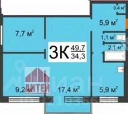Общая площадь — 49,6 м². Планировка удобная: две изолированные комнаты и одна проходная, санузел раздельный.