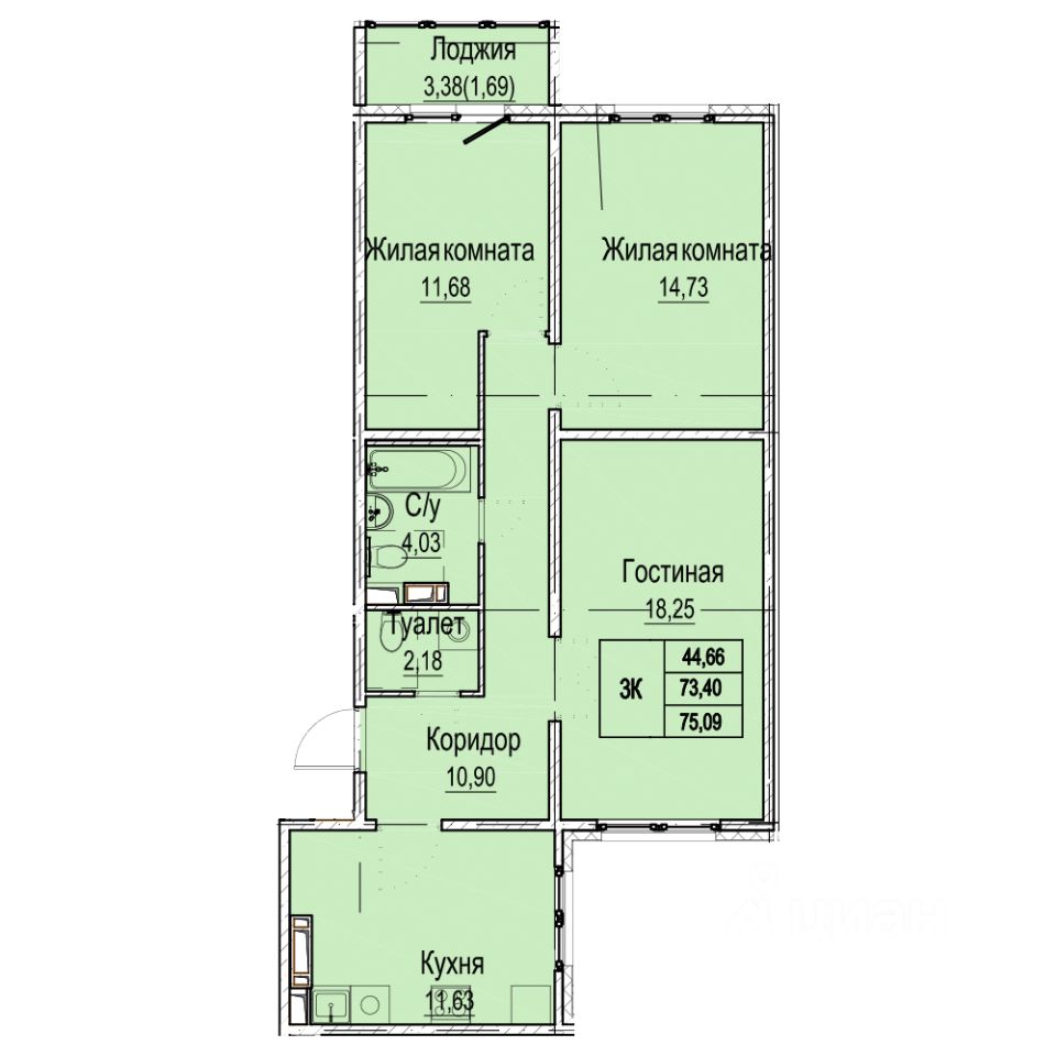 Общая площадь75,09 м²