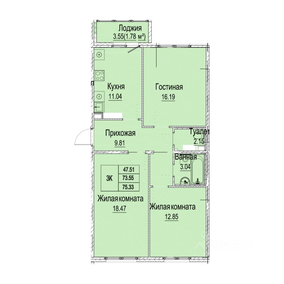 Общая площадь75,31 м²