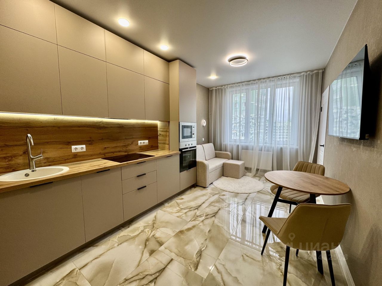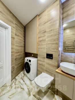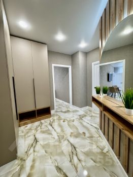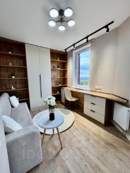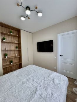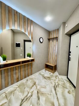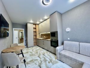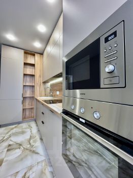 В квартире выполнен евроремонт по дизайн-проекту из дорогих материалов: встроенный кухонный гарнитур со встроенным холодильником, посудомоечной машиной, индукционной варочной поверхностью и духовым шкафом.