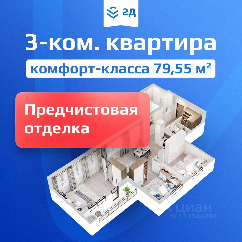 3-комнатная квартира евроформата, 79,55 кв.м. При проектировании планировочных решений в ЖК "2Д Федосеенко" мы исходили из сценариев жизни современной семьи.