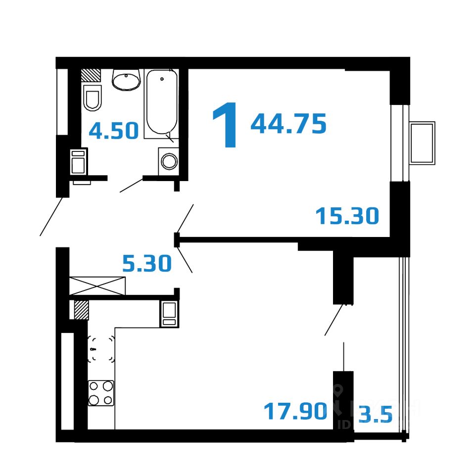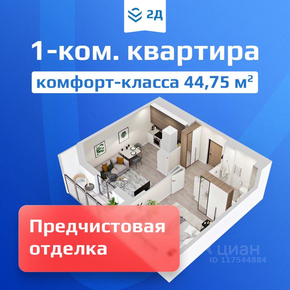 1-комнатная квартира евроформата (44,75 кв.м.) в ЖК "2Д Федосеенко" в Сормовском районе Нижнего Новгорода.