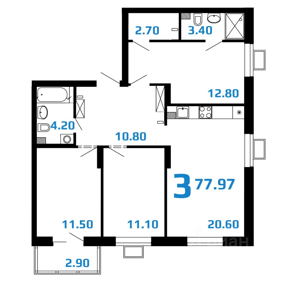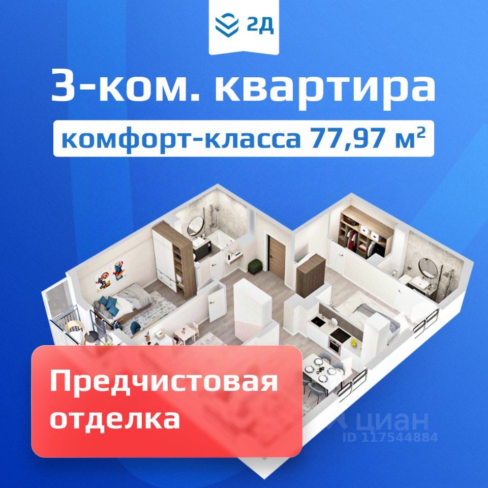 3-комнатная квартира евроформата в жилом комплексе "2Д Федосеенко" (77,97 кв.м.).