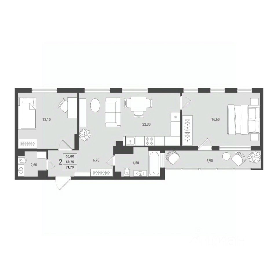 2-комнатная квартира евроформата в жилом комплексе "2Д Федосеенко" (68,75 кв.м.).
