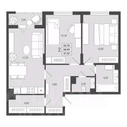 Правильная форма комнат (13,10 и 13 кв.м.) позволит комфортно обустроить родительскую спальню и детскую.