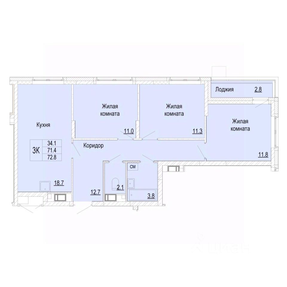В продаже трехкомнатная квартира (планировка евро-формата), расположенная в доме 14 (по генплану) в ЖК "Новая Кузнечиха".