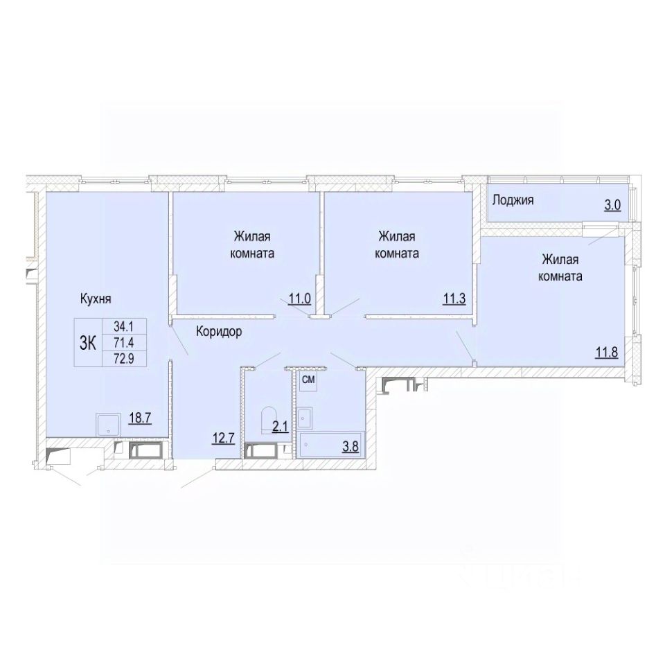 В продаже трехкомнатная квартира (планировка евро-формата), расположенная в доме 14 (по генплану) в ЖК "Новая Кузнечиха".
