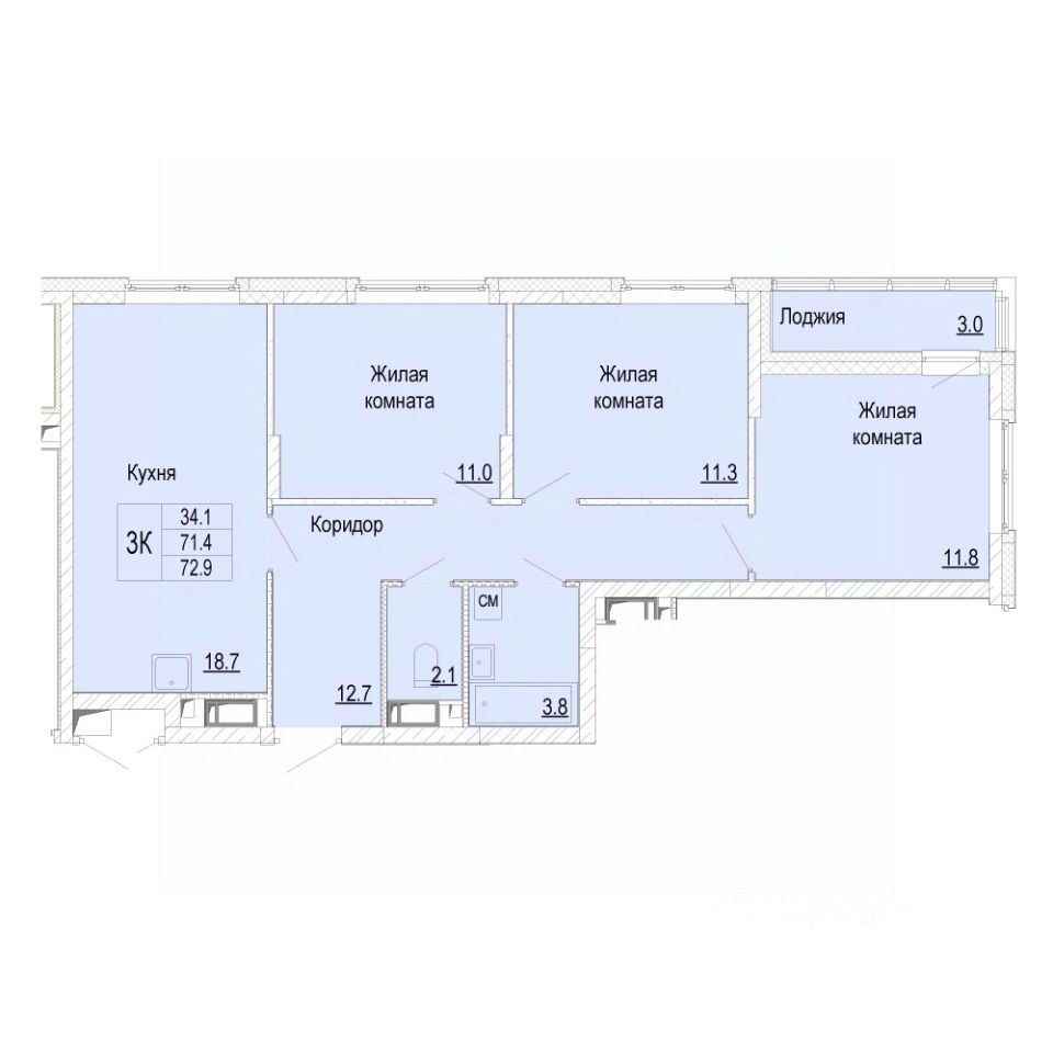 В продаже трехкомнатная квартира (планировка евро-формата), расположенная в доме 14 (по генплану) в ЖК "Новая Кузнечиха".