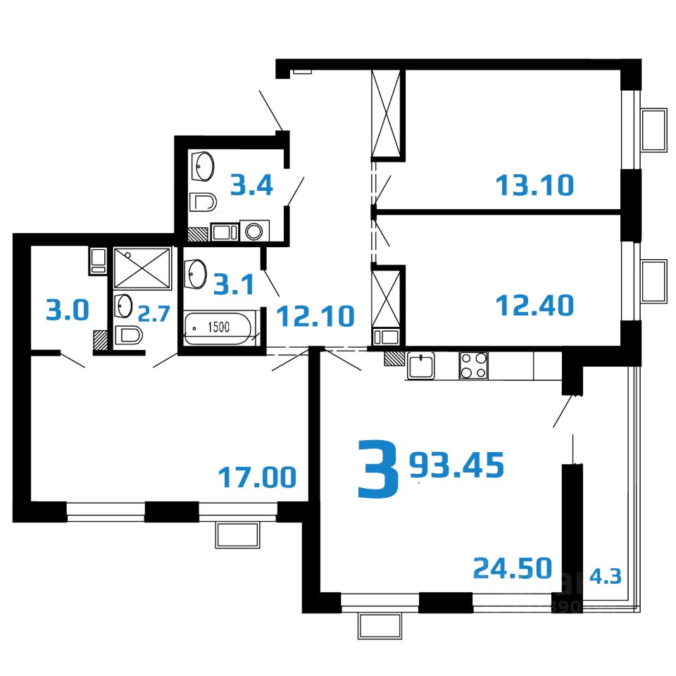 3-комнатная квартира евроформата, 93,45 кв.м. При проектировании планировочных решений в ЖК "2Д Федосеенко" мы исходили из сценариев жизни современной семьи.