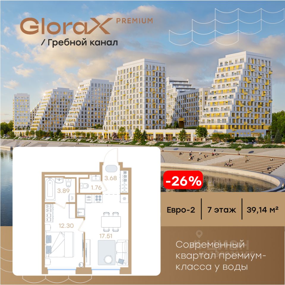 Продается 1-комн. квартира на 7-м этаже в строящемся проекте премиум-класса GloraX Premium Гребной канал. Общая площадь лота составляет 39,14 кв. м, из которых 12,30 кв. м отведено под жилую и 17,51 кв. м под кухонную зону. Номер квартиры - 327.