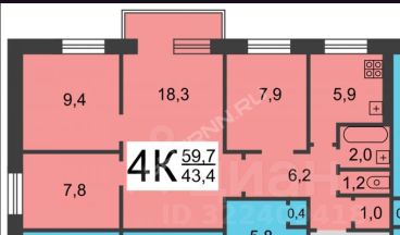 Общая площадь квартиры 60 кв. м., Жилая 44 кв. м. имеет 4 комнаты.