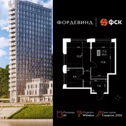 Продаётся 1-к квартира номер 224 общей площадью 45 кв.м. на 7-м этаже 16 этажного здания. Отделка Whitebox. Цена с учётом скидки.