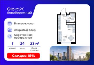 Продается квартира-студия на 24-м этаже в строящемся проекте бизнес-класса GloraX Левобережный. Общая площадь лота составляет 23,22 кв. м, из которых 11,52 кв. м отведено под жилую и 5,03 кв. м под кухонную зону. Номер квартиры - 134.