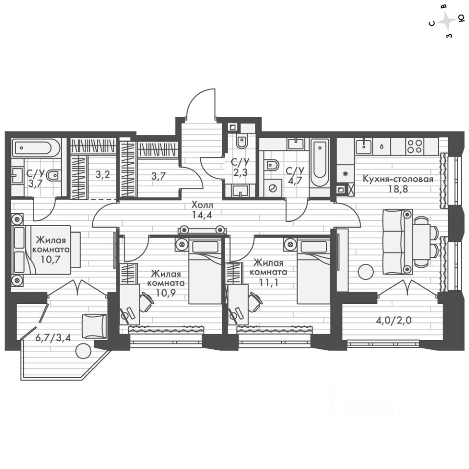 - Мастер-зона с санузлом и гардеробной. Всё для вашего комфорта и удобства, включая личный санузел и гардероб.