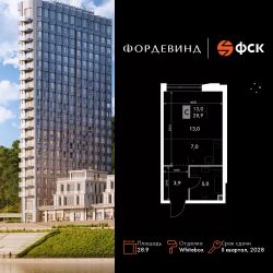 Продаётся квартира-студия номер 271 общей площадью 28.9 кв.м. на 12-м этаже 16 этажного здания. Отделка Whitebox. Цена с учётом скидки.