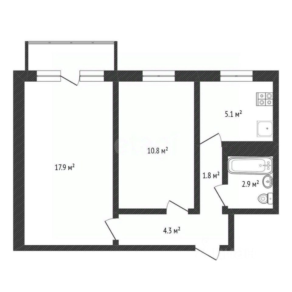 Общая площадь — 43,8 м², жилая — 29,5 м², кухня — 5,1 м².