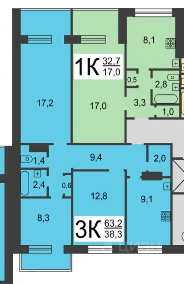 1 лоджия, 1 балкон