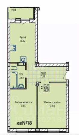 Квартира 2-х комнатная: 2-й этаж, предчистовая отделка, эргономичная планировка: кухня 10.6 м, две комнаты, с/у совмещенный.