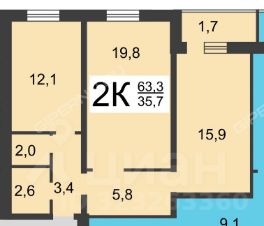 От собственника 2-х комнатная квартира площадью 60,8 кв.м., а с учетом лоджии 62,4 кв.м.