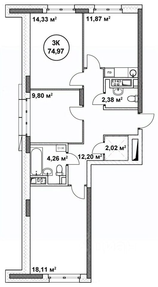 74,97 м²