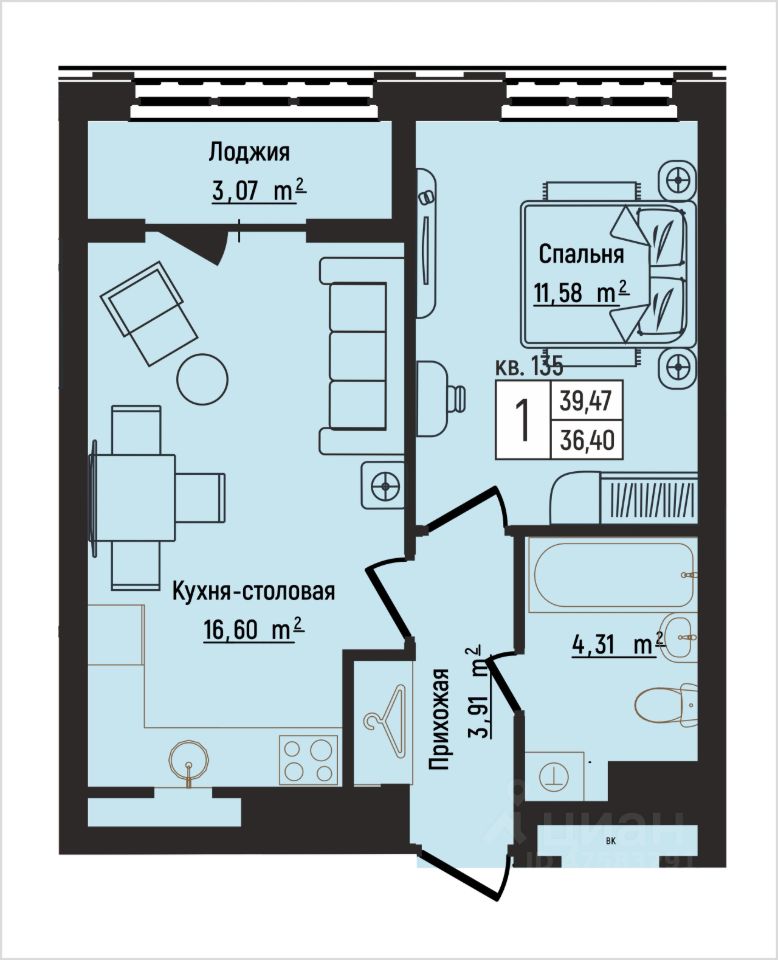 Общая площадь39,47 м²