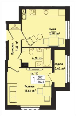 Общая площадь38,71 м²