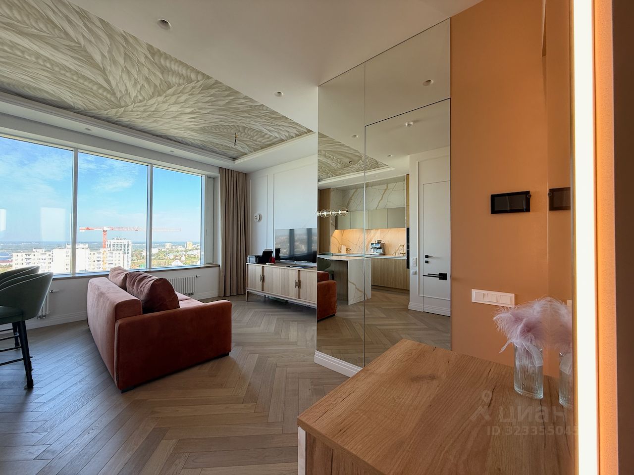 Удобная функциональная планировка, по сути евротрёшка: просторная кухня-гостиная с панорамой на Стрелку, практичная спальня плюс удобный кабинет, с видом на Оку, большая гардеробная, раздельный санузел.