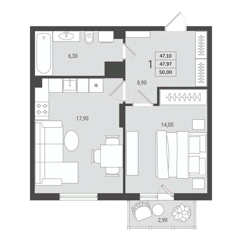 Просторная 1-комнатная квартира евроформата (47,97 кв.м.) в ЖК "2Д Федосеенко" в Сормовском районе Нижнего Новгорода.