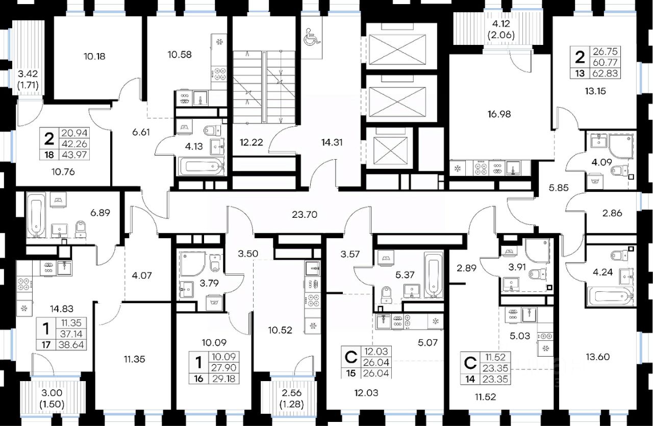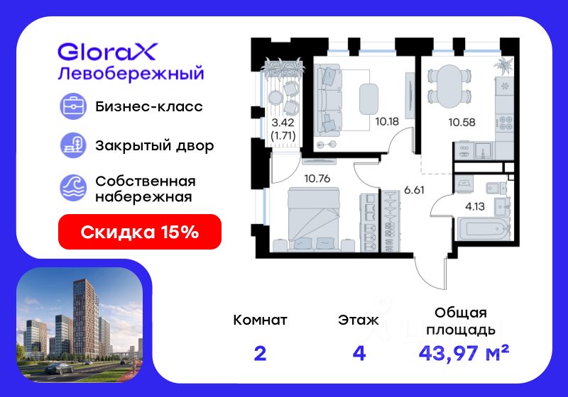 Продается 2-комн. квартира на 4-м этаже в строящемся проекте бизнес-класса GloraX Левобережный. Общая площадь лота составляет 43,97 кв. м, из которых 20,94 кв. м отведено под жилую и 10,58 кв. м под кухонную зону. Номер квартиры - 18.