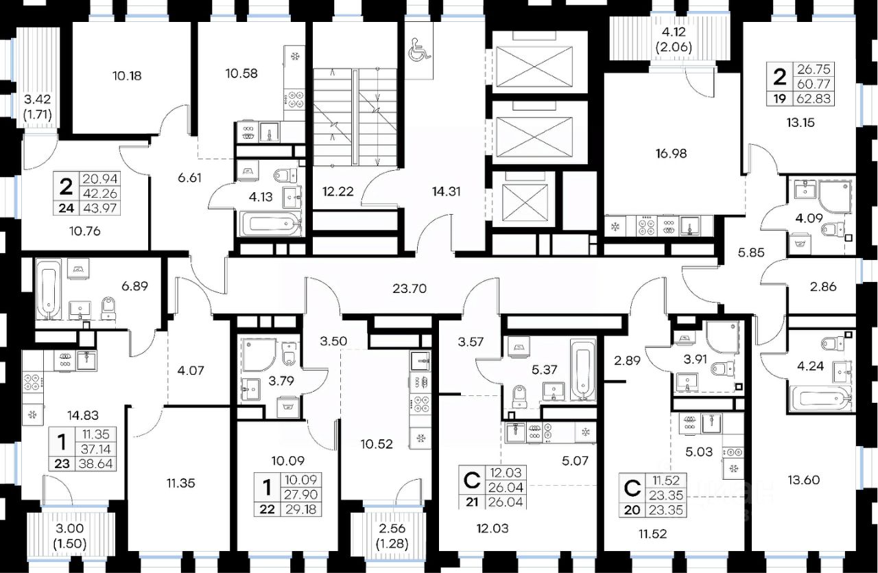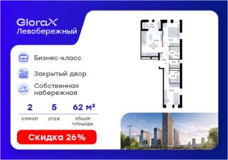 Продается 2-комн. квартира на 5-м этаже в строящемся проекте бизнес-класса GloraX Левобережный. Общая площадь лота составляет 62,83 кв. м, из которых 26,75 кв. м отведено под жилую и 16,98 кв. м под кухонную зону. Номер квартиры - 19.