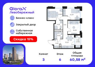 Продается 3-комн. квартира на 6-м этаже в строящемся проекте бизнес-класса GloraX Левобережный. Общая площадь лота составляет 60,58 кв. м, из которых 31,23 кв. м отведено под жилую и 10,37 кв. м под кухонную зону. Номер квартиры - 198.