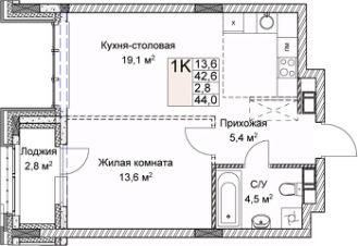 1-комн. квартира от застройщика в ЖК "Симфония Нижнего" на 5 этаже. Квартира без отделки, после выдачи ключей можно делать ремонт. Общая площадь: 44 кв.м., жилая: 13.6 кв.м., площадь просторной кухни-столовой: 19.1 кв.м. Все окна выходят на одну сторону. В квартире один балкон, один совмещенный санузел. Высота потолков 3.0 м.