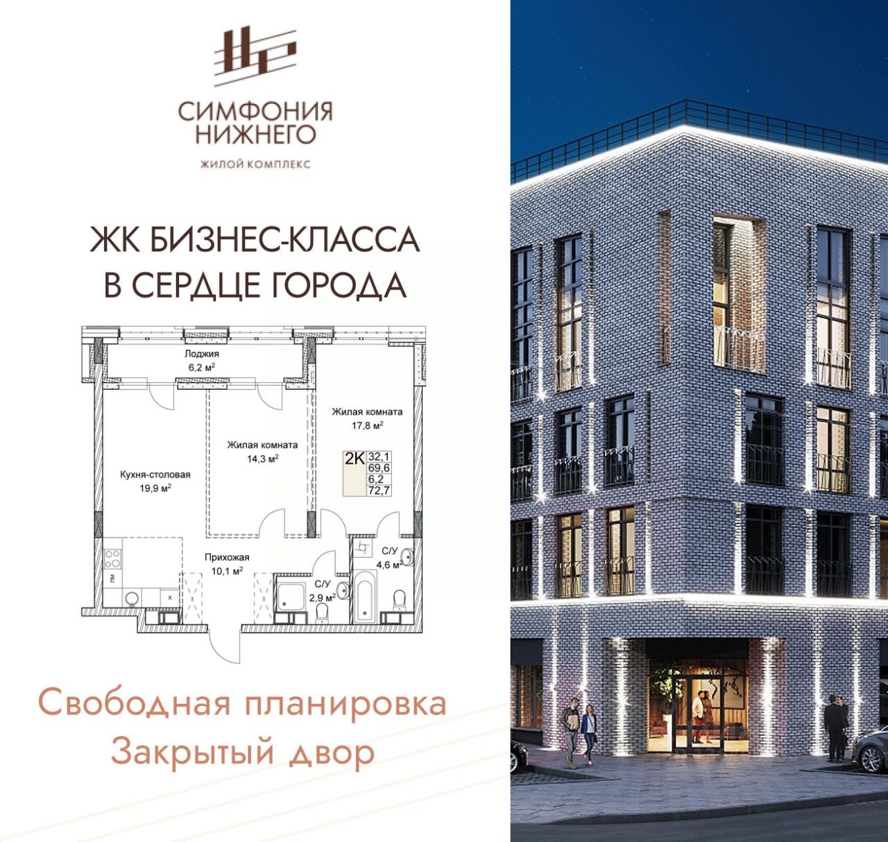 2-комн. квартира в ЖК "Симфония Нижнего" на 5 этаже. Квартира без отделки, после получения ключей можно делать ремонт. Общая площадь: 72.7 кв.м., жилая: 32.1 кв.м., площадь просторной кухни-столовой: 19.9 кв.м. Комнаты изолированные, все окна выходят на одну сторону. В квартире одна лоджия, два совмещенных санузла. Высота потолков 3.0 м.