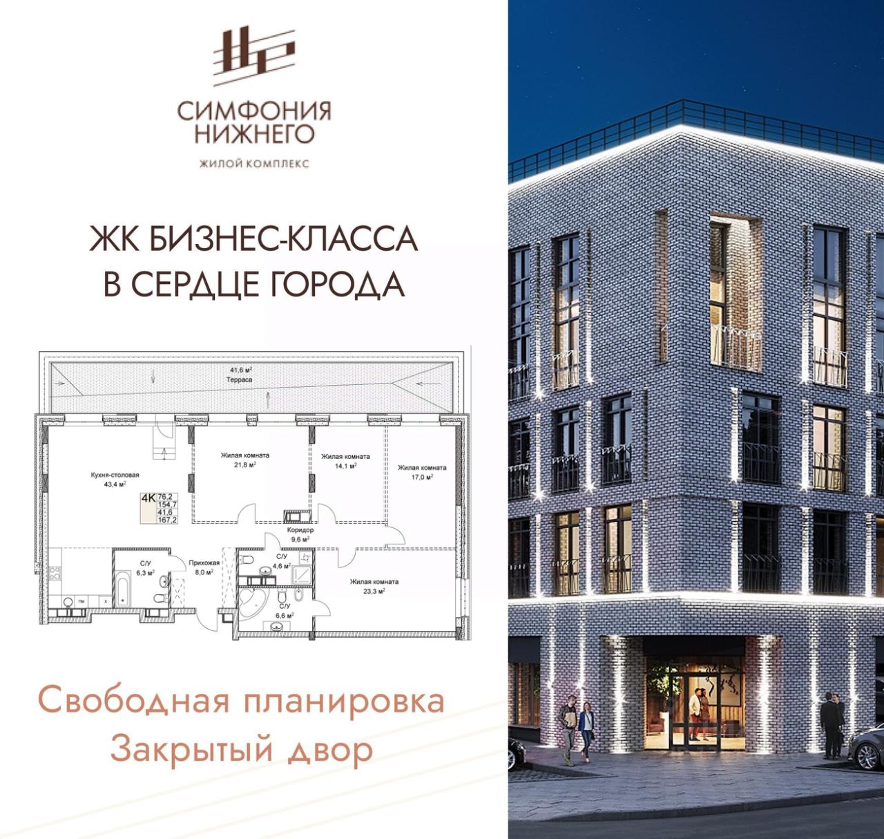 Четырехкомнатная квартира от застройщика в ЖК "Симфония Нижнего" на 7 этаже. Квартира без отделки, новый владелец может сделать ремонт по своему дизайн-проекту. Общая площадь: 167.18 кв.м., жилая: 76.2 кв.м., площадь просторной кухни-столовой: 43.4 кв.м. Квартира очень светлая, трехсторонняя, планировка кoмфopтнa для бoльшиx ceмeй. В квартире один балкон, три совмещенных санузла. Терраса представляет собой роскошную зону отдыха, где вы на свой вкус можете создать атмосферу комфорта и уюта. Высота потолков 3.0 м.