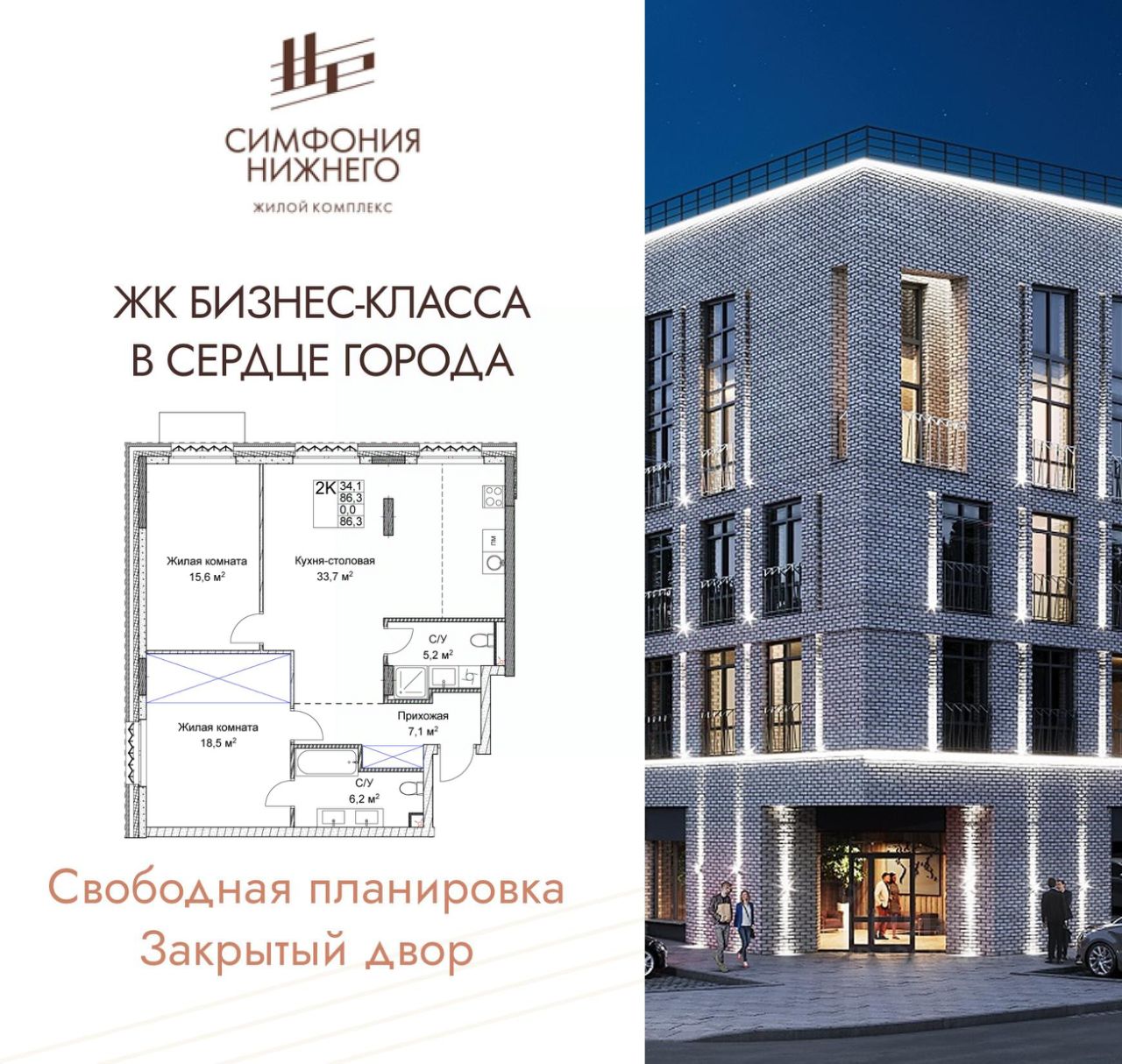 2-комн. квартира от застройщика в ЖК "Симфония Нижнего" на 2 этаже. Квартира без отделки, полностью готова к чистовой отделке и дальнейшему ремонту. Общая площадь: 86.3 кв.м., жилая: 34.1 кв.м., площадь просторной кухни-столовой: 33.7 кв.м. Угловая квартира, окна oбecпeчивaют paвнoмepнoe ocвeщeниe в тeчeниe дня. В квартире два совмещенных санузла. Высота потолков 3.0 м.