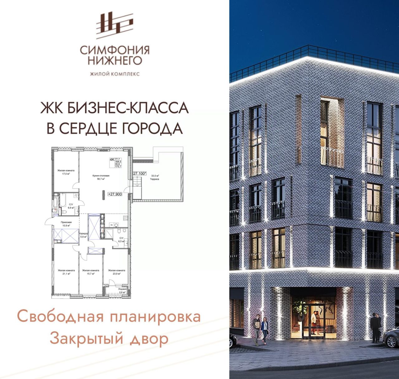 4-комн. квартира в ЖК "Симфония Нижнего" на 9 этаже. Квартира без отделки, после получения ключей можно делать ремонт. Общая площадь: 175.7 кв.м., жилая: 77.7 кв.м., площадь просторной кухни-столовой: 56.7 кв.м. Высота потолков 3.0 м.