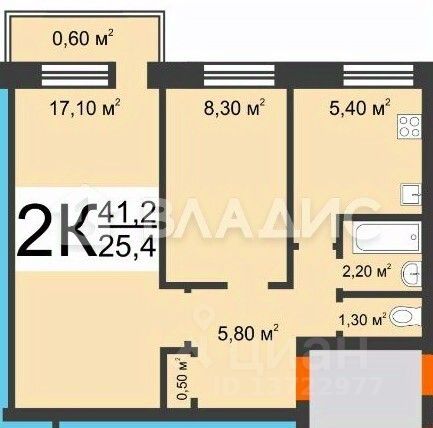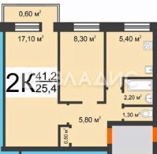 Общая площадь квартиры: 41,2 кв. метра.
