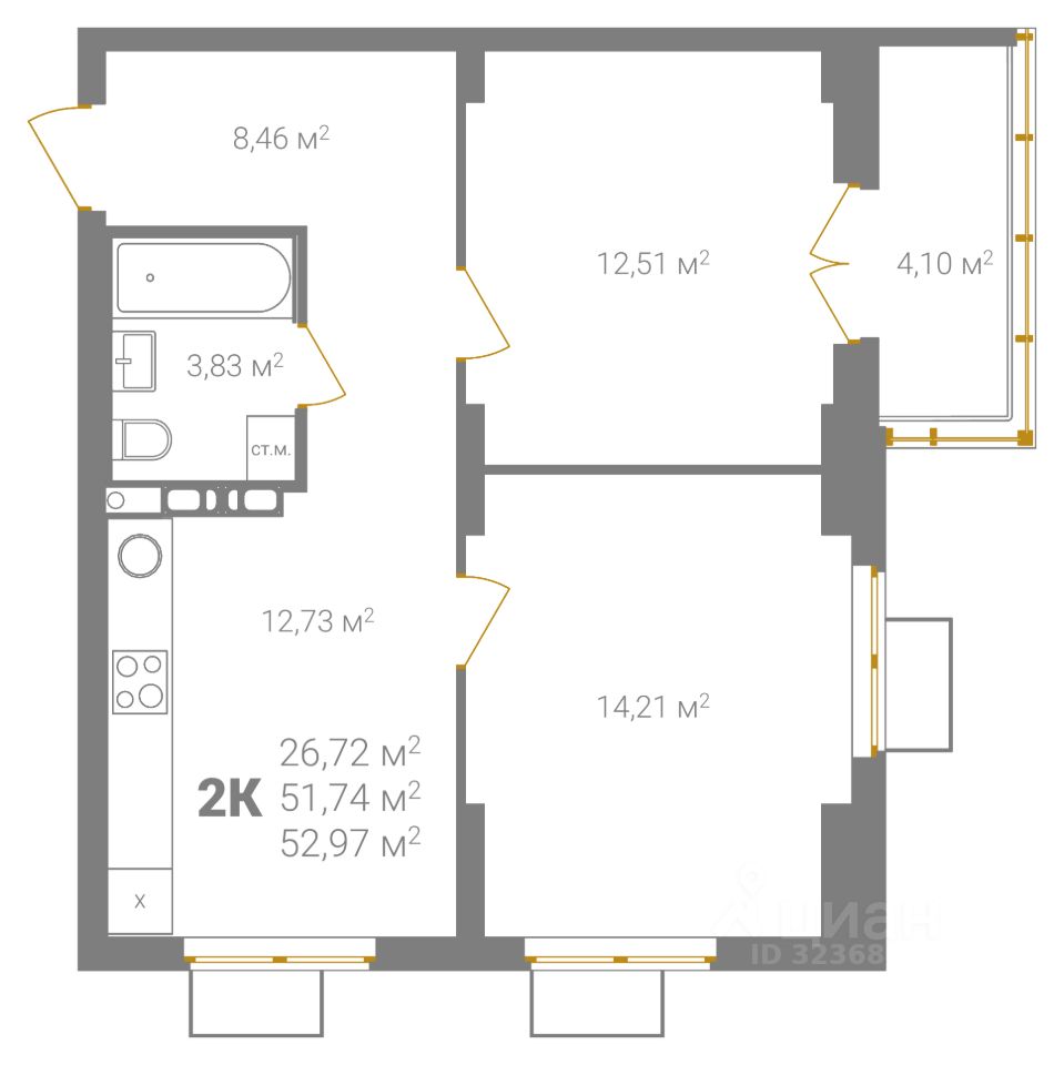 Общая площадь52,97 м²