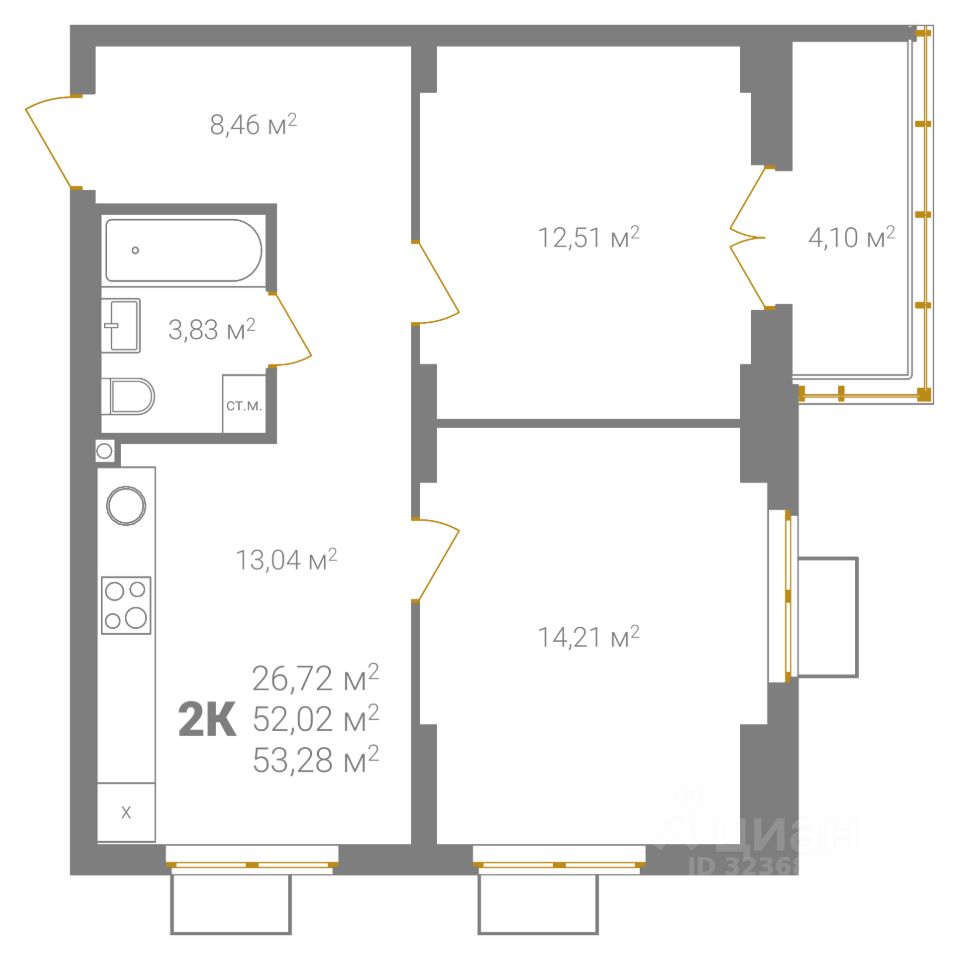 Общая площадь53,28 м²
