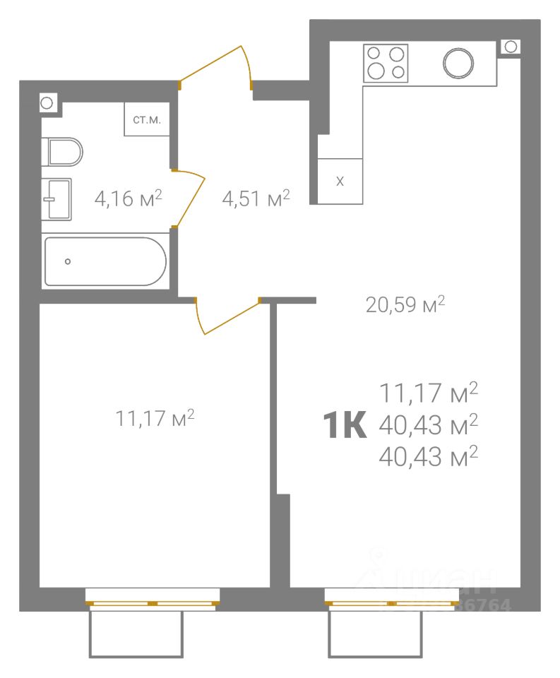 Общая площадь40,43 м²