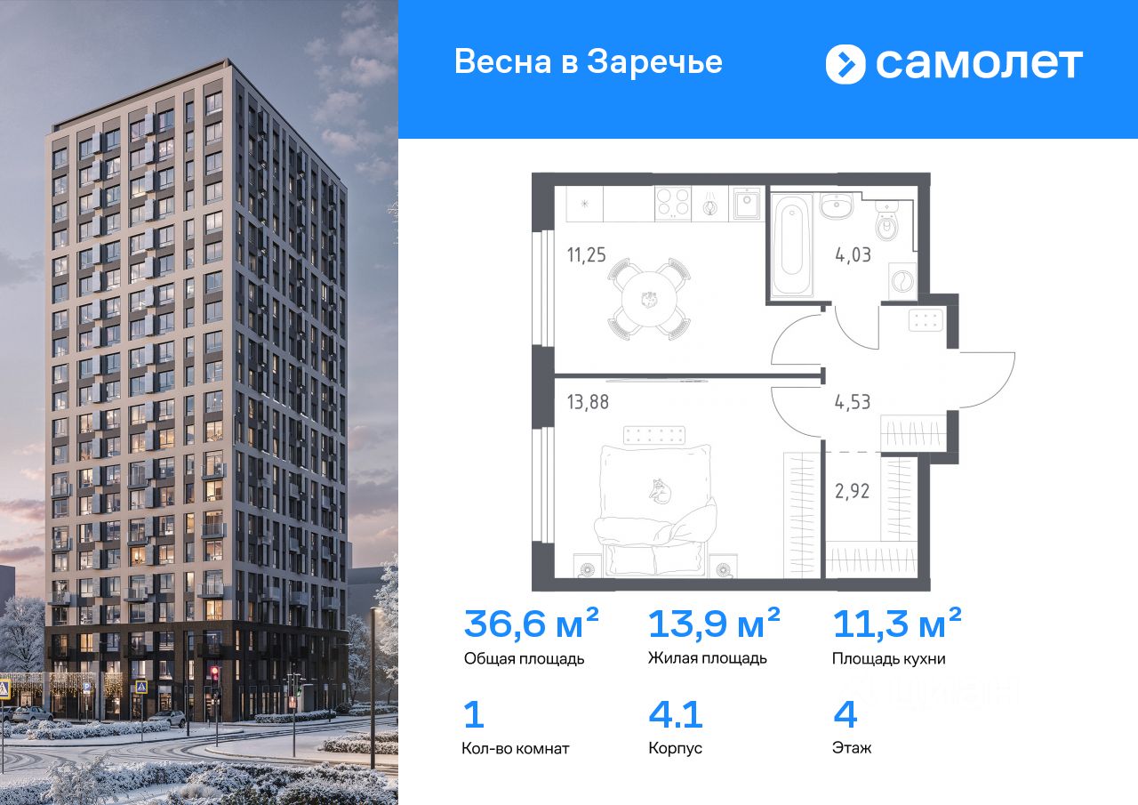 Строим кварталы для жизни с заботой о будущем. Предлагается 1-комнатная квартира комфорт-класса 36,61 кв.м в корпусе 4.1 на 4 этаже, в ЖК "Весна в Заречье"