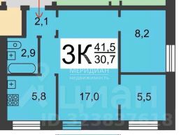 Комнаты 17 + 8.2 + 5.5 кв. м., кухня 5.8 кв.м.