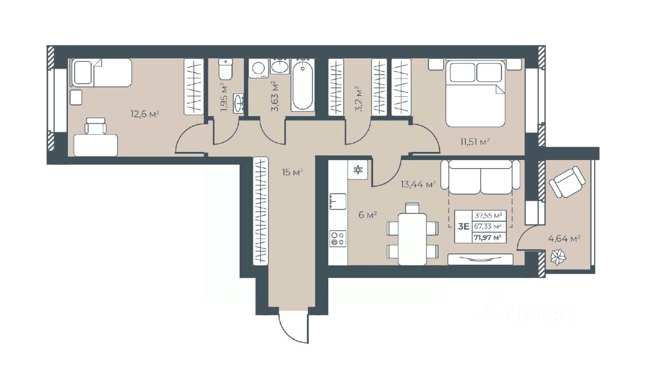 Продаётся 3-комнатная квартира в строящемся доме (Дом 1), срок сдачи: III-кв. 2027, общей площадью 71.97 кв.м., на 6 этаже. Новый жилой комплекс "Ботаника Парк" от застройщика "БМ Групп" расположен по адресу Россия, Нижегородская область, Выкса, квартал Инженера Шухова.