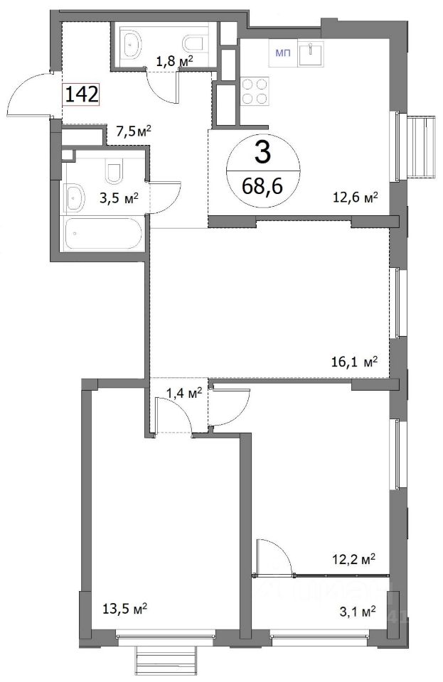 Общая площадь68,6 м²